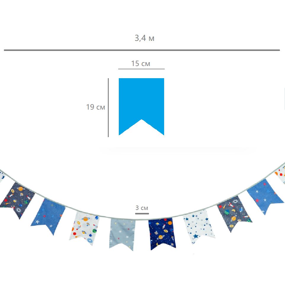 Гирлянда состоит из 12 флажков, общая длина составляет 3,4 м, расстояние между флажками 3 см, длина матерчатых флажков 2,1 м, длина лямок с обеих сторон по 50 см