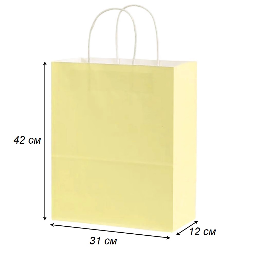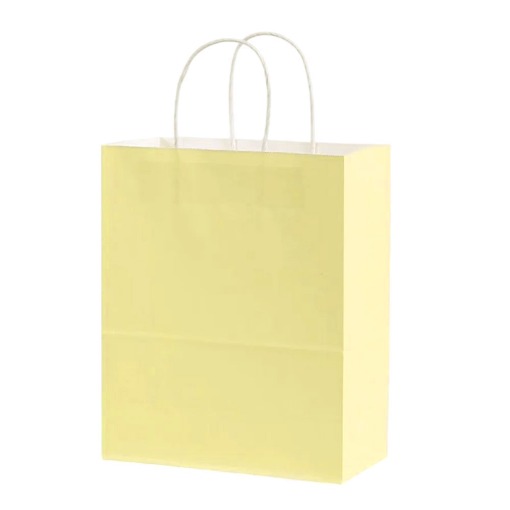 Подарочный пакет из крафтовой бумаги пастельного оттенка с белыми бумажными ручками и белой внутренней стороной.