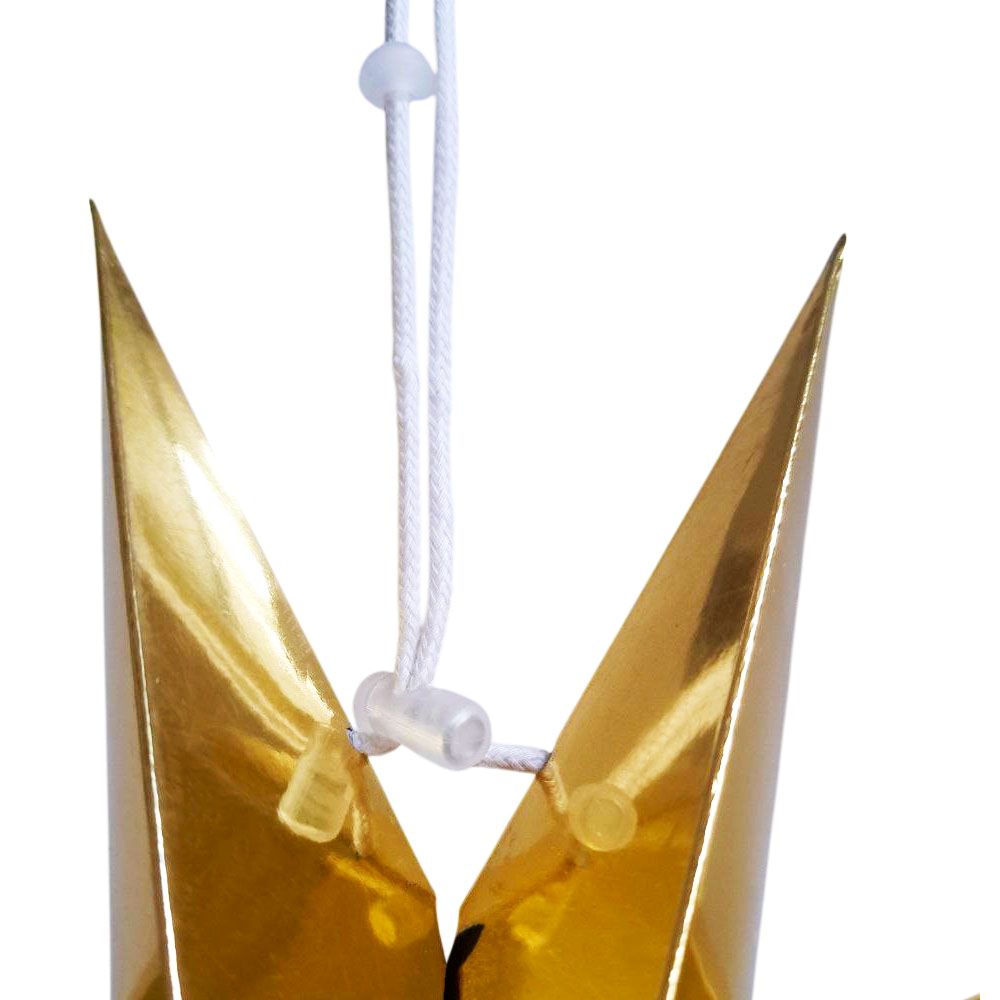 Объёмная декоративная звезда из картона диаметром 30 см с 9 лучами. Оснащена встроенным шнурком для подвешивания. Поставляется в компактном сложенном виде и быстро собирается: специальный шнурок при затягивании придаёт изделию объём и фиксирует форму. После сборки звезда остаётся устойчивой без дополнительных креплений и может использоваться многократно.