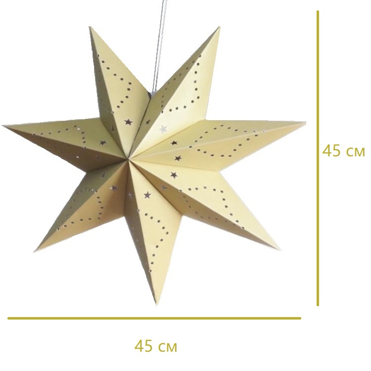 Семиконечная объемная звезда 45 см — великолепный декор из тонкого перфорированного картона. Создает красивые световые эффекты. Поставляется в сложенном виде, в комплекте шнур для фиксации объема и подвеса.